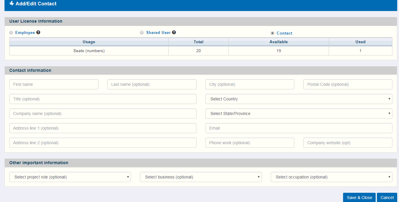 Under the User License Information section select the license agreement of the user. You can save the new contact as Employee, Shared User or just an individual Account Contact (called Lite User after getting access to a Collection).